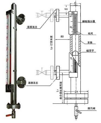 磁翻板液位计主体外的翻板箱受主体内浮子(具有定向磁性源,按不同介质和压力针对研制)的作用促其翻板翻动并显示红白颜色,并随浮子的移动指示不同的液面高度。在指示器左侧配有醒目的刻度标尺,从而使液位的指示显得更加清晰。