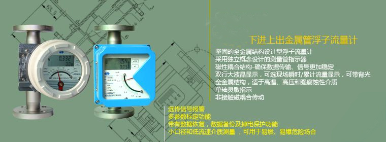 金属管浮子流量计是YH仪表采用可变面积式测量原理生产研究,适用于测量液体,气体。全金属结构,有指示型、电远传型、耐腐型、高压型、夹套型、防爆型。具有 0-10mA,4-20mA的标准模拟量信号输出和现场指示。累积,数字通讯,现场修改测量参数,不同的供电方式功能,带有磁性过滤器和特殊规格品种。广泛应用于,石油、化工、发电、制药、食品、水处理等。复杂,恶劣环境条件,及各种介质条件的流量测量过程中。